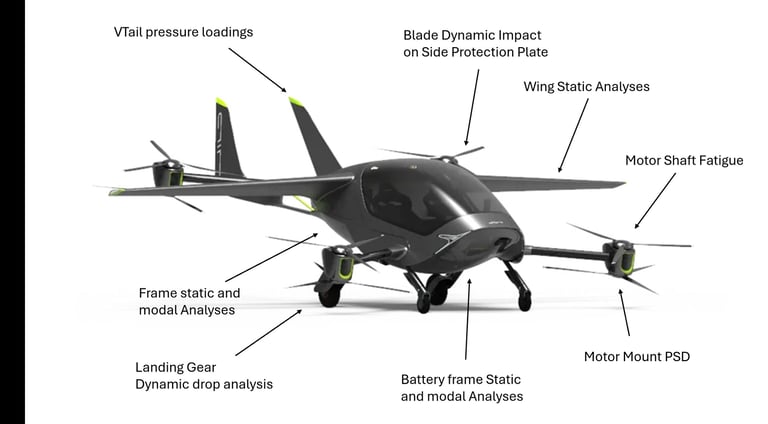 A comprehensive structural analysis suite for the AIR EVToL, covering Static, Modal, PSD Vibration, and Drop-test simulations for primary flight components.